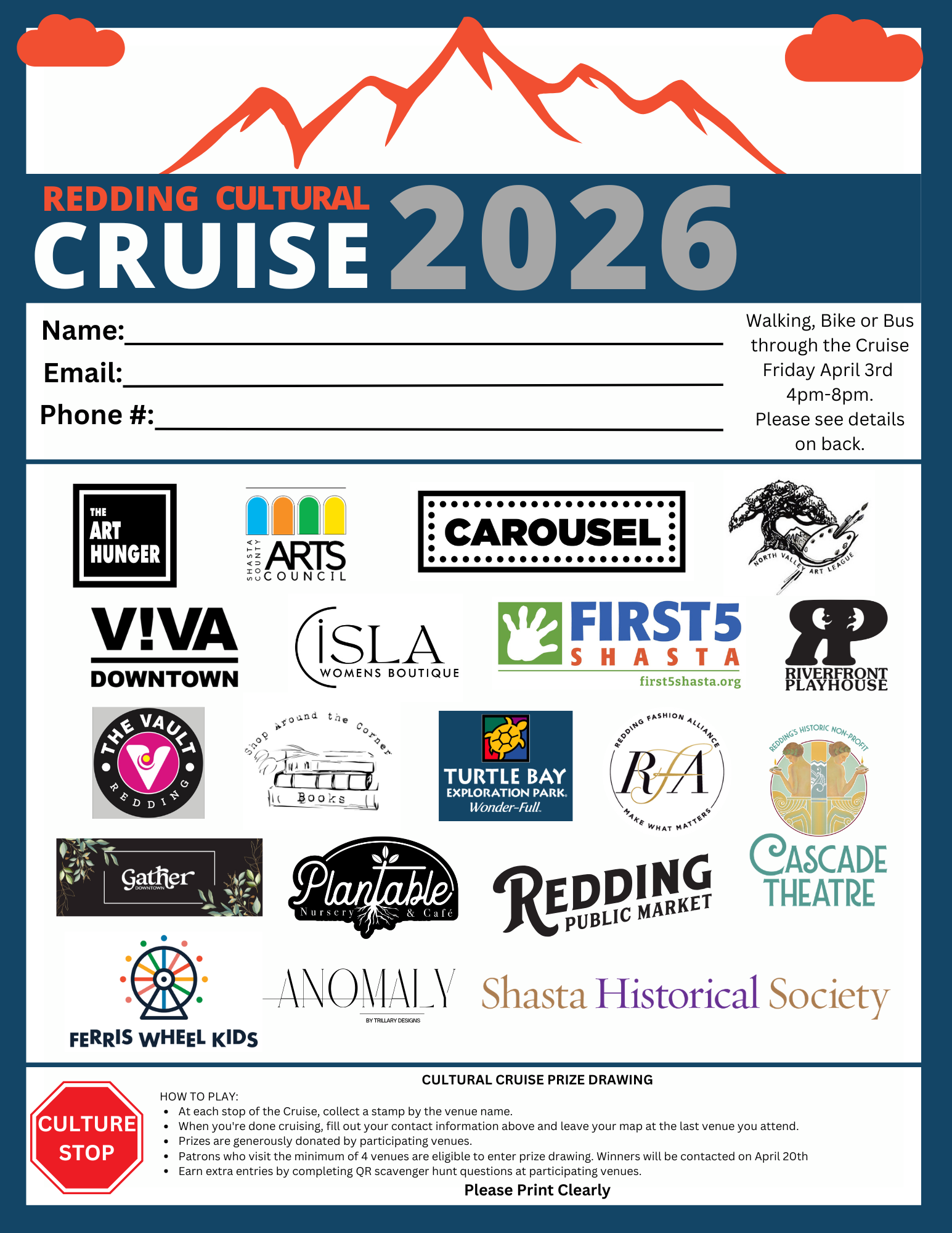 Completed passports can be dropped off at Shasta County Arts Council same day or anytime before April 10 during regular business hours (Tuesday-Friday 10am-4pm).