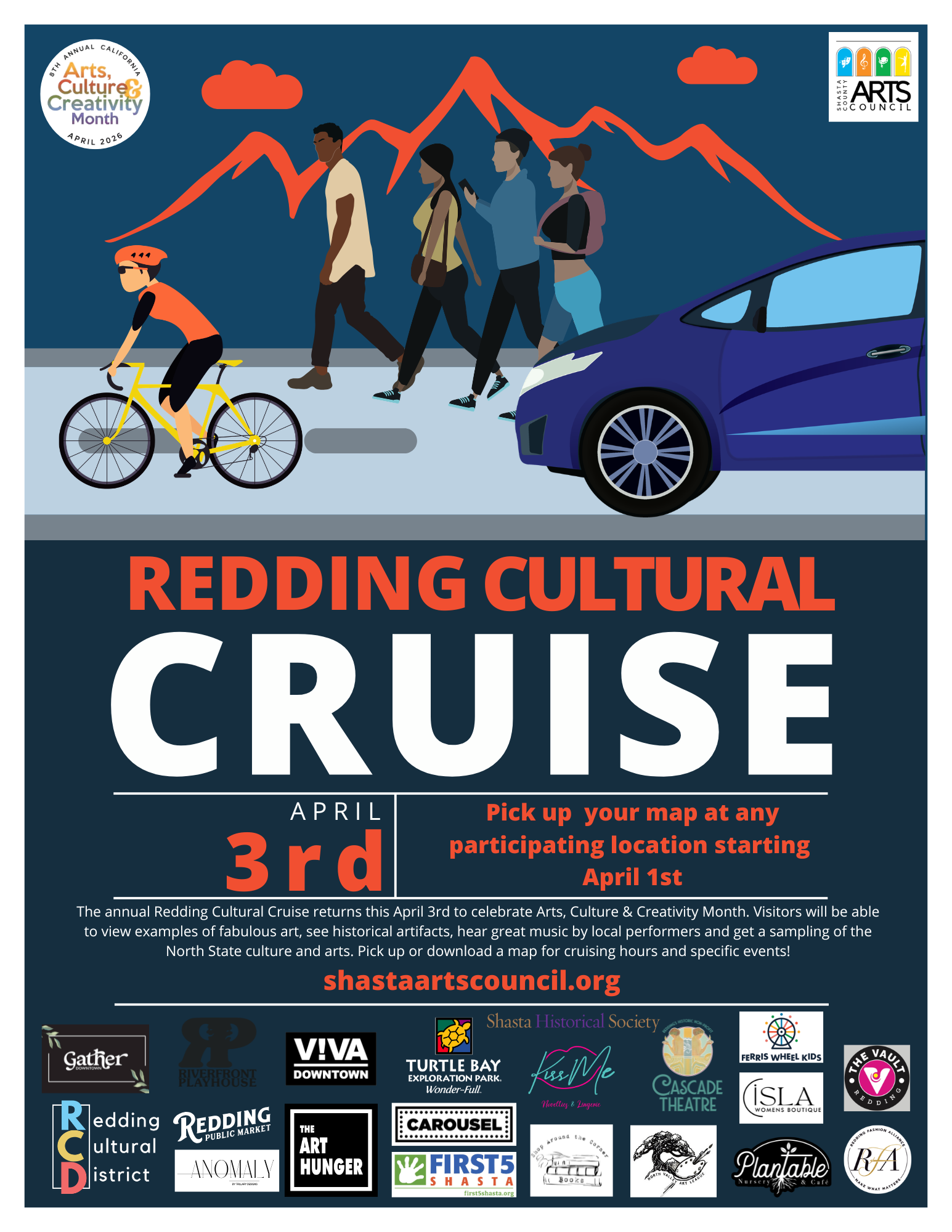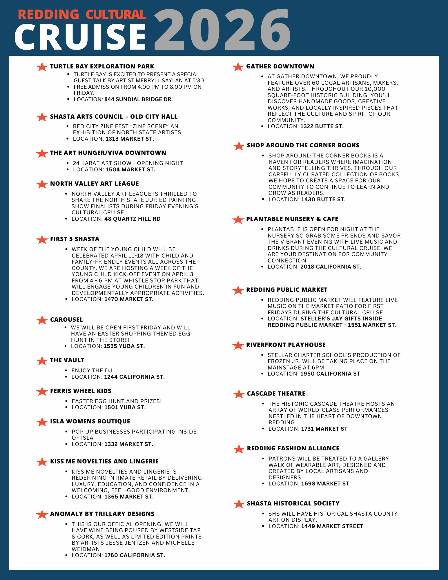 The Redding Cultural Cruise is a self-guided First Friday experience where you can visit participating locations, discover local artists and businesses, and experience the creative energy of our community.
