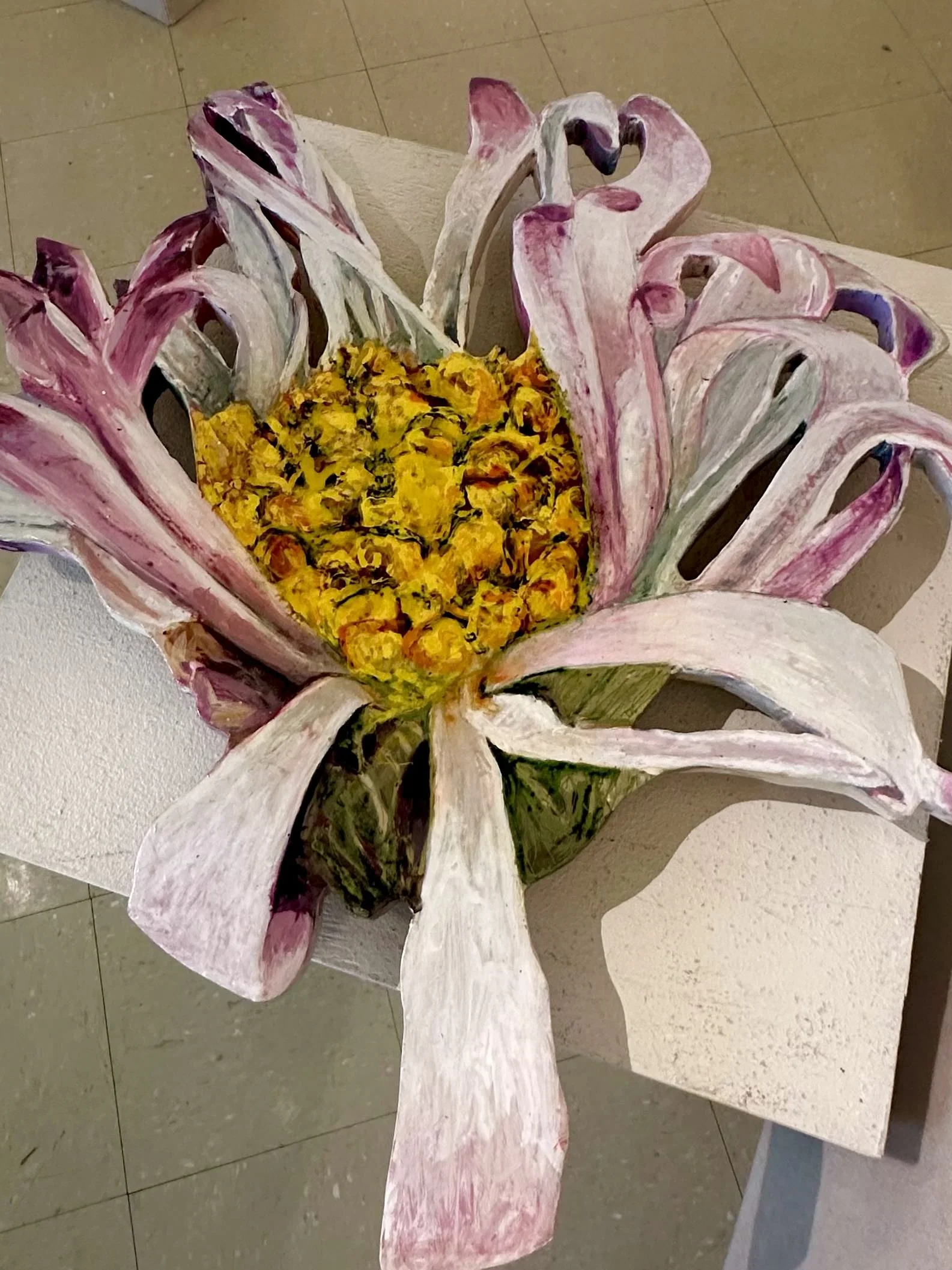 Harsh sunshine, blustery winds, and other scarring life events impact a flower’s vainglory. Brilliance and virility transform into muted tones, variegated petals, curled stamens, and pistils. What was once vibrant and vigorous slowly returns to earth. These observations led to the current body of work: The first flower painting I completed was of a Floribunda rose species called, “Rosie theRiveter.” I constructed a shaped panel out of thin plywood and 2 X lumber as a painting surface. The original photo had such a strong sculptural element that I used the outline of the rose as the shape of the painting’s surface. It was my intention to allow the painted rose to exist on the wall both as a painting and as an object that could be viewed from different angles showing shapes, colors, and other indications of its construction and history.